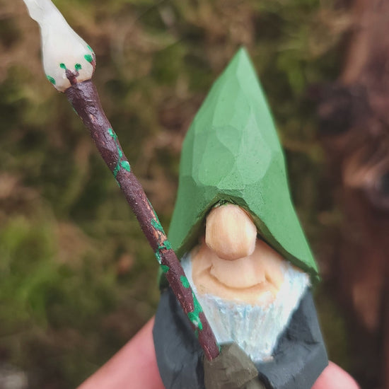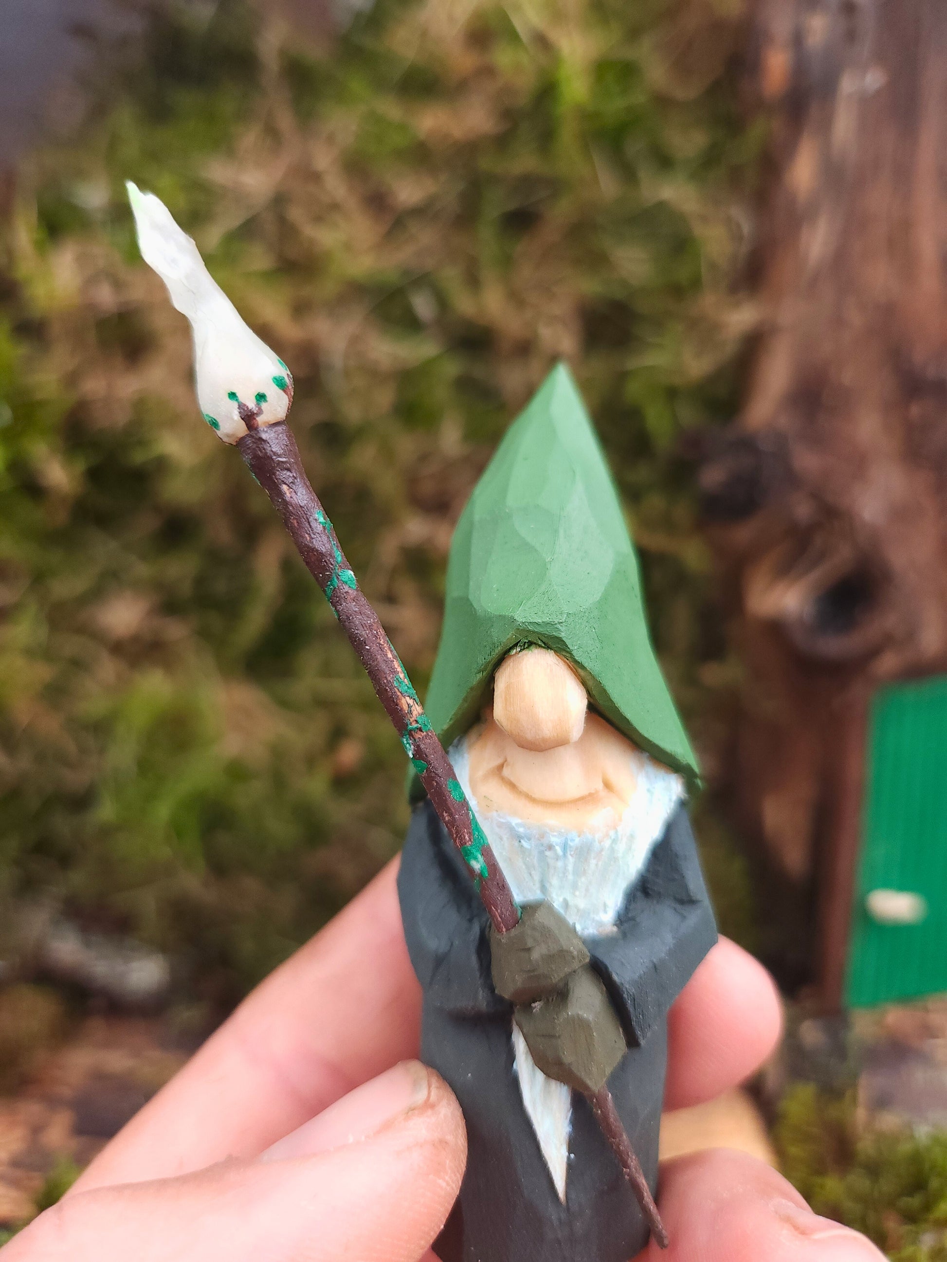 En mystisk liten Trollkarls-Nisse, handtäljd i lindträ och målad med min egen traditionella äggoljetempera. I sin hand håller han en stav vars topp är fylld med UV-resin och självlysande pigment – och när mörkret faller börjar även hans skägg att glöda, som om magin själv vaknar till liv.
