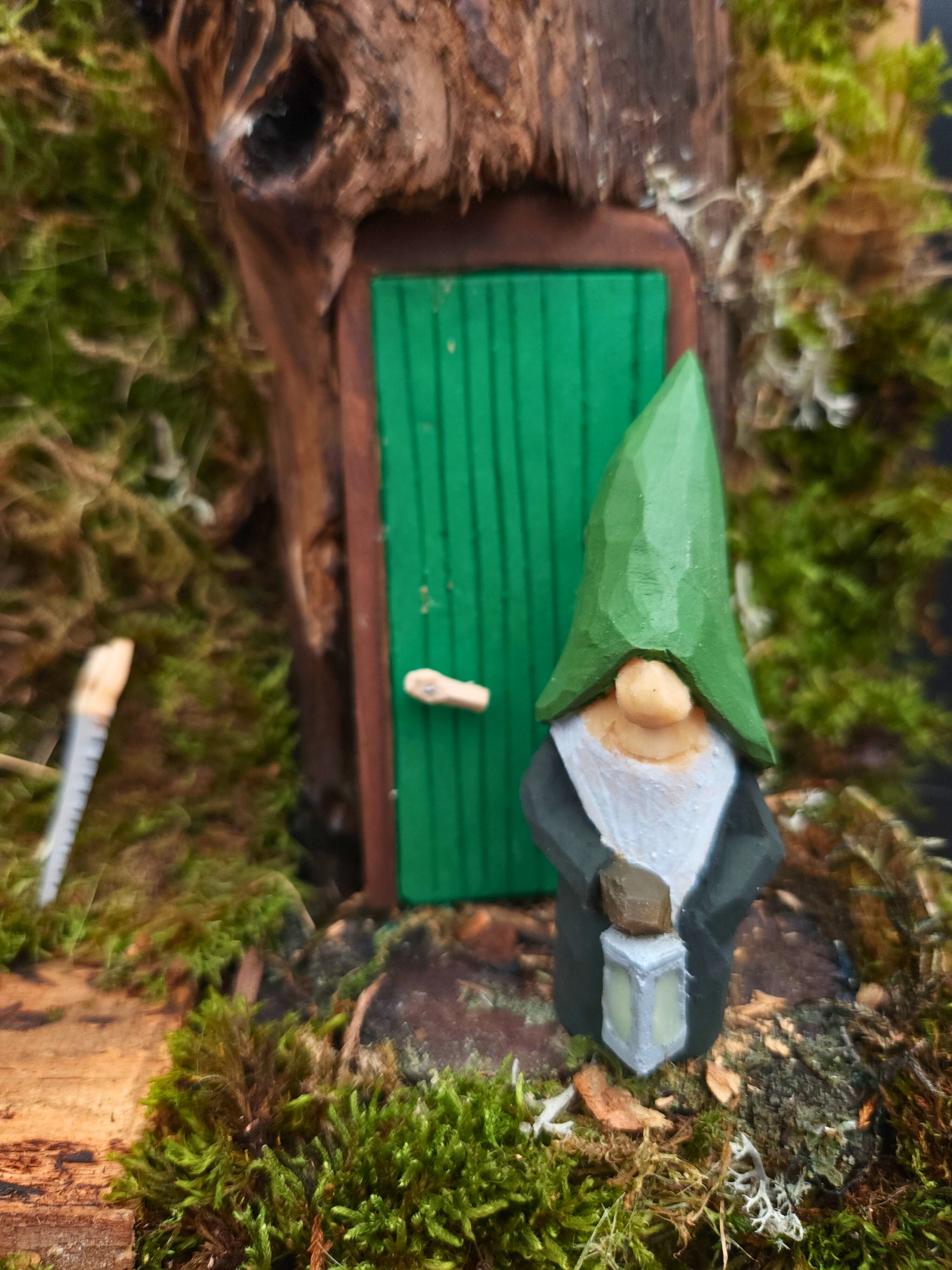 Figuren är snidad i lindträ och målad med min egen äggoljetempera av naturliga pigment. Själva lyktan är målad med akryl och fylld med resin och självlysande pulver, vilket gör att den glöder mjukt i mörkret – som en magisk låga.